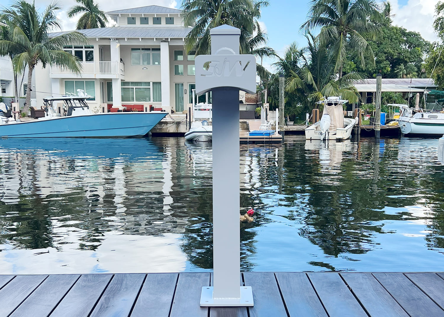 Compact and cleanly designed, the Sea Post is a durable pedestal built to house dockside hookups. The 4×4 model is made for water connections, while the 6×6 model is built for water and an externally mounted electrical connection. Power features like the GFCI outlet and weatherproof cover are installed on the outside of the pedestal, with wiring run by an electrician. Made from marine-grade aluminum with a powder-coat finish, each Sea Post comes fully assembled, ready to mount, and can be customized with finishes, inlet placement, and optional waterjet-cut designs on the hose holder.